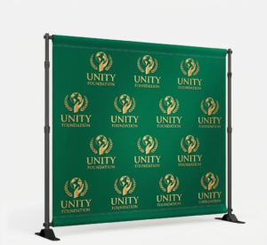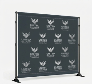 Our Step and Repeat Backdrop includes both the custom printed graphic and durable large-tube hardware for a complete, professional display. The 9oz wrinkle-free dye sublimated fabric delivers vibrant color with a low-sheen finish ideal for photography. The adjustable aluminum frame provides excellent stability and assembles quickly, making it perfect for trade shows, media events, and photo backdrops.